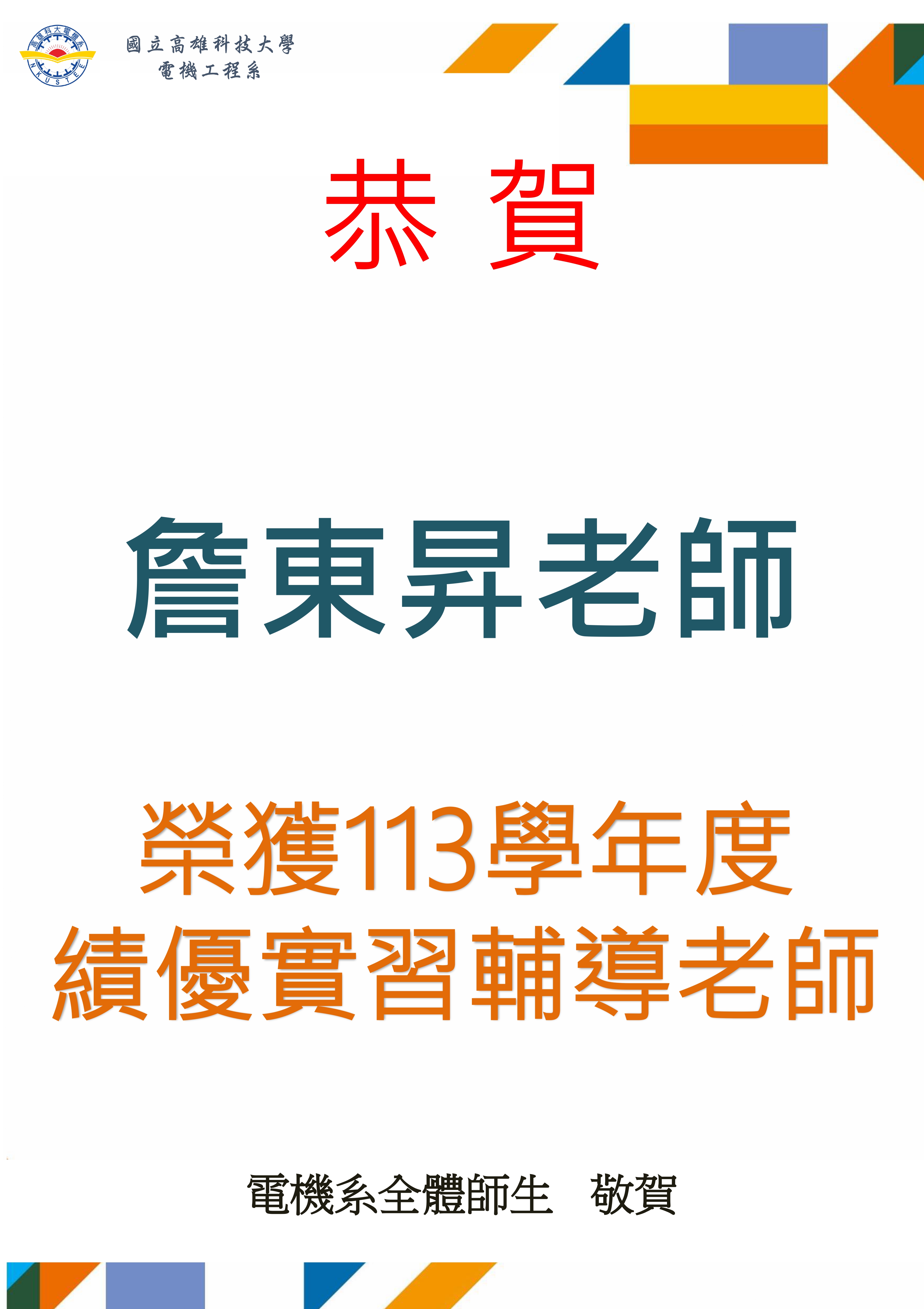 恭賀!詹東昇老師榮獲113學年度績優實習輔導老師
